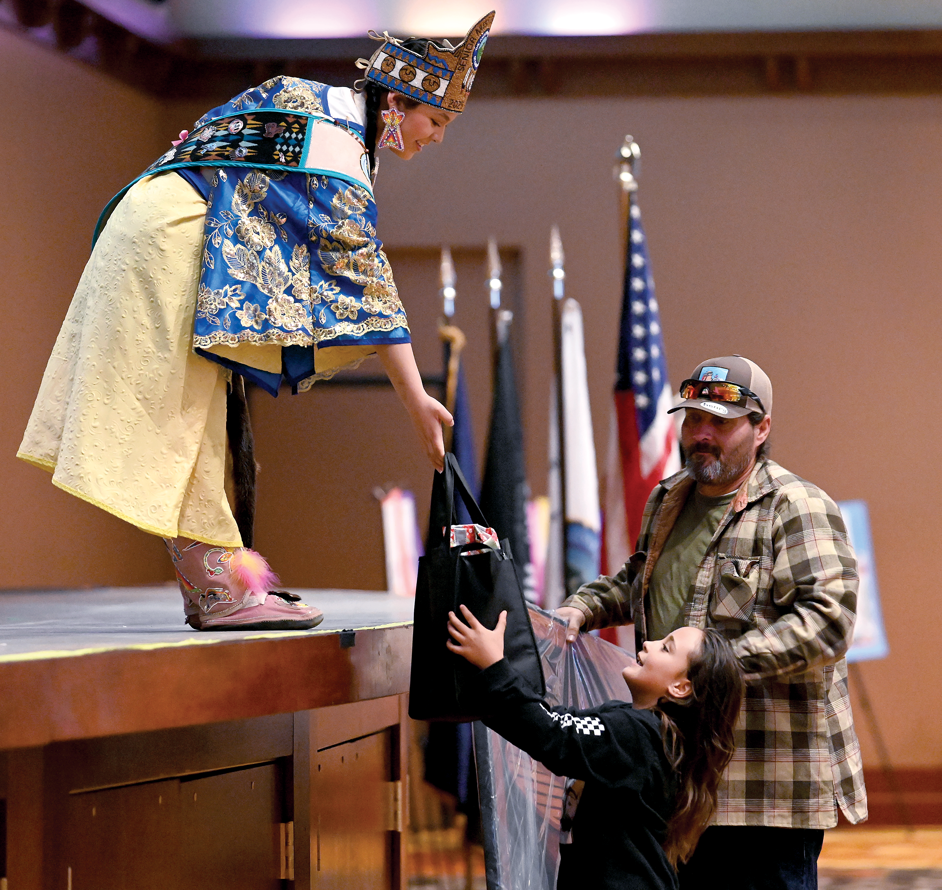 Senior Miss Grand Ronde Marie Quenelle, 15, left, hands Nova King, 7, a bag of raffle prizes as her grandfather, Tribal member Barry Larsen, looks on during the Tribe’s 42nd Restoration Celebration at Spirit Mountain Casino’s Event Center Friday, Nov. 21. (Photo by Michelle Alaimo)