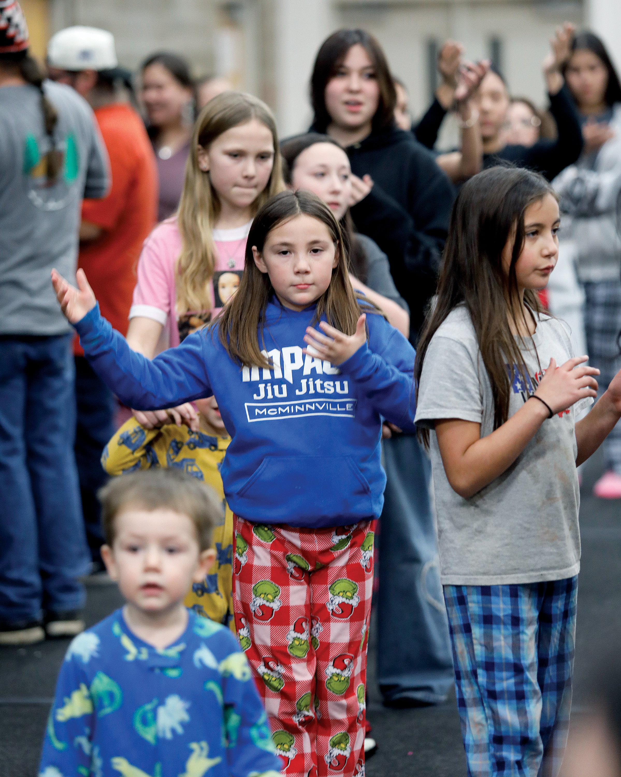 Mila Linton dances during the Pajama Jam held in the Tribal gym in January. The Tribe’s Public Health Department holds several jams throughout the year to help create bonds among Tribal members, connect young people to their Elders, teach them Tribal traditions, help them find their own voices and let them know that they are not alone. The Youth Empowerment & Prevention Program encourages attendance at these and other youth-oriented events to help with its goals of connection and suicide prevention. (Smoke Signals file photo)